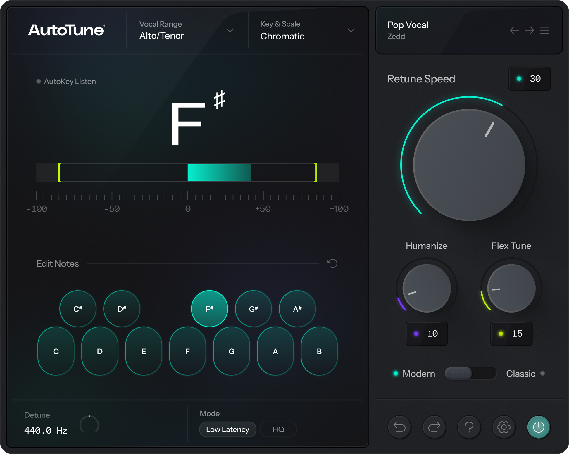 - Modern Mode delivers transparent, natural-sounding pitch correction