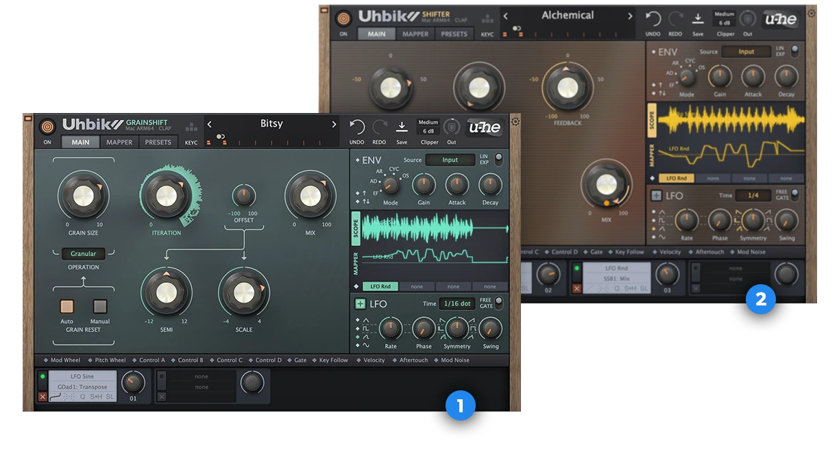Uhbik’s built-in oscilloscope is an essential visual aid for crafting rhythmic effects. You can view the audio output and/or up to four modulation signals at the same time—including the output of a modulation matrix slot—in any combination.