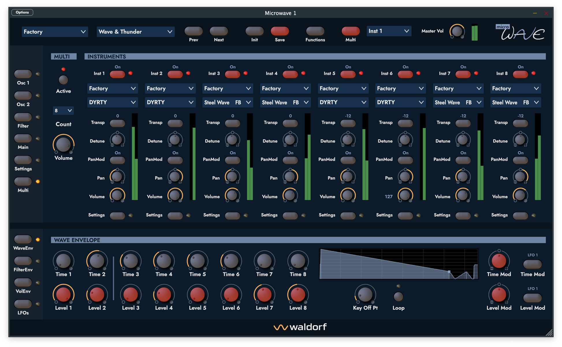 - Unique 8 stage wave envelope with variable key-off point and looping.